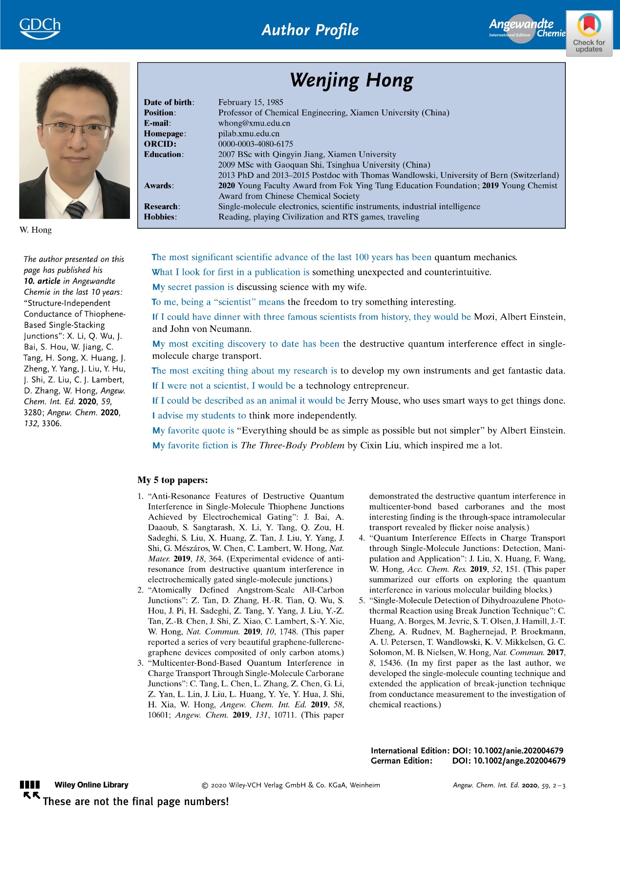 近日,化学领域世界顶级期刊《德国应用化学》“Author Profile”专栏对厦门大学化学化工学院洪文晶教授进行了人物专访介绍(Angew. Chem. Int. Ed. 2020, 59, 2)。该栏目每期均会邀请在过去10年内在该期刊累计发表10篇以上原创性科研论著的学者,以对话方式分享他们的学术心得和生活趣事。