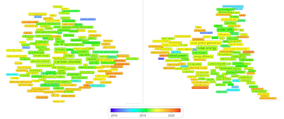 图:关键词内容变迁——碳减排技术子学科(左)、可再生能源子学科(右)(2010-2021)数据源:Scopus