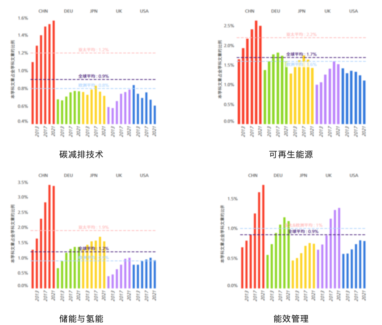 在重点国家中,中国在四个能源子学科的发文占比不仅远超对标国家,更高于全球平均水平(0.9%-1.7%不等)。储能与氢能是中国能源全学科占比最高的子学科,与其他对标国家相比的优势也最为突出。