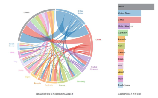 图:能源学科国际合作发文产出排名前12国家(右)以及各国间的合作关系图(左)(2010-2021)数据源:Scopus