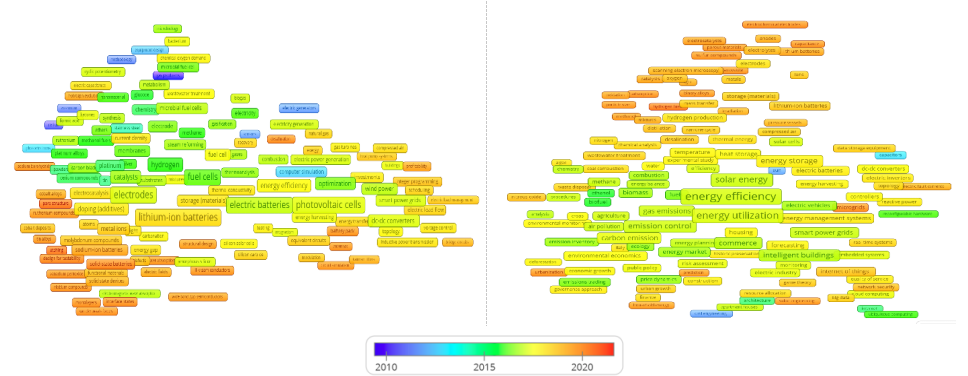 图:关键词内容变迁——储能与氢能(左)、能效管理(右)(2010-2021)数据源:Scopus