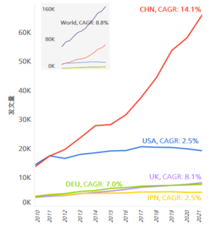 图:全球及对标国家在能源学科的发文趋势和年均复合增长率(CAGR)(2010-2021)数据源:Scopus