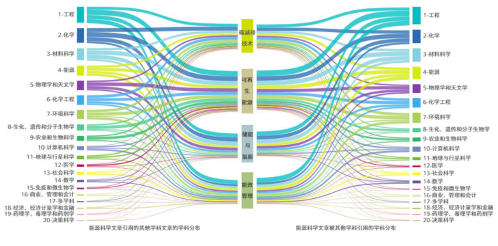 能源学科具有很强的交叉性,其文章的引用与被引涉及到众多学科,除了与其关系最密切的理科领域(化学、材料科学、能源、物理学和天文学等)和工程学科外,还涵括了生物学、社会科学、经济金融学以及商业管理学科等。