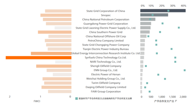 图:中国能源学科研究领域内发文量前二十产学合作企业的产学合作发文量、学科发文占比及FWCI(2010-2021)数据源:Scopus