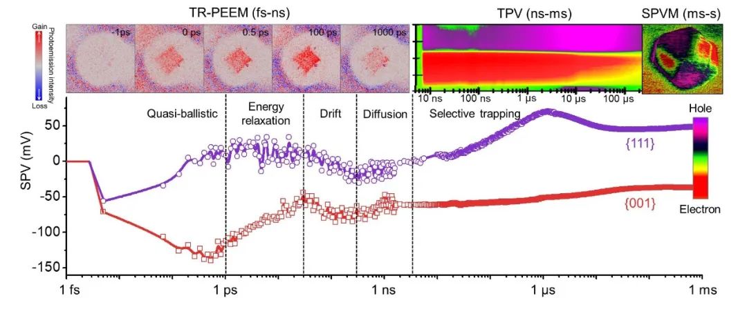 为了更好地了解纳秒范围内高效电荷分离机制,研究人员使用了时间分辨光发射电子显微镜,发现了光生电子在亚皮秒时间尺度就可以选择性地转移到特定晶面区域,电子在超快的时间尺度上可以从一个表面移动到另一个表面。