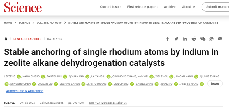 中心副主任王野教授、秘书长傅钢教授和上海光源姜政研究员(现中国科学技术大学教授)等利用铟元素在反应条件下的动态迁移特性和铑单原子的高效C-H键活化能力,创制出高达5500小时以上寿命的超高稳定性In/Rh@S-1催化剂,在近热力学平衡收率条件下高选择性催化丙烷等低碳烷烃直接脱氢制取对应烯烃。相关成果以“Stable anchoring of single rhodium atoms by indium in zeolite alkane dehydrogenation catalysts”为题于2024年3月1日发表在Science 期刊 (2024, 383, 998-1004)。