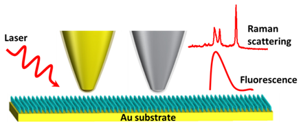 针尖增强光谱具有极高的空间分辨率,并可同时提供待测物的结构及形貌信息。然而,当STM型针尖应用于增强荧光技术中,荧光分子和金属针尖(及金属基底)存在非辐射能量转移,导致荧光“猝灭”,无法获得荧光信号。针对这一瓶颈问题,课题组发展了壳层隔绝针尖增强荧光光谱(Shell-Isolated Tip-Enhanced Fluorescence Spectroscopy)。通过在金、银针尖表面包覆不同厚度、不同材料的惰性壳层,制备出壳层隔绝针尖。理论计算和实验表明壳层隔绝针尖仍具有很强的电磁场增强能力,并且壳层还可以隔绝或减弱荧光分子和金属针尖之间的非辐射能量转移,从而将荧光增强因子大幅提升至1.7×103。利用壳层隔绝针尖,首次在单张针尖增强光谱图中同时获得了分子的荧光和拉曼信号,同时反映出分子的电子信息及化学结构信息,且通过改变壳层厚度,可实现针尖增强拉曼信号和荧光信号比例的可控调节。