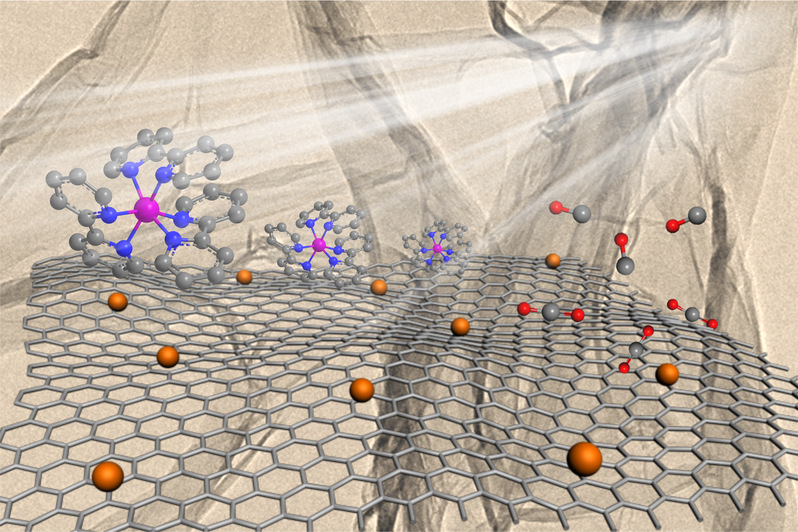 iChEM研究人员、中国科学技术大学应用化学系熊宇杰课题组针对吸光单元与单原子催化中心之间的鸿沟,采用还原氧化石墨烯为桥梁,促进了吸光单元向单原子催化中心的光生电子转移过程,实现了光催化CO2的高转化数(TON)。在该工作中,研究者选用具有优异光吸收性能的均相光敏剂[Ru(bpy)3]Cl2作为吸光单元,同时在还原氧化石墨烯上通过配位方式构筑了单原子Co催化中心,形成了高效光催化CO2还原体系。国家同步辐射实验室宋礼教授课题组利用X射线吸收谱,详细表征出了还原氧化石墨烯上的单原子Co配位结构。在该体系中,还原氧化石墨烯起到双重作用。一方面,还原氧化石墨烯表面具有残余的C/O官能团,可以作为配体稳固地锚定Co单原子催化中心。Co单原子与载体间的强相互作用可以改变Co单原子的电荷状态,从而影响活化CO2分子的能力。另一方面,还原氧化石墨烯具有大比表面积和优异导电能力,有助于光生电子通过π−π界面相互作用从吸光单元向催化中心进行转移,从而调控整个光催化体系的效率。基于该设计,通过调节[Ru(bpy)3]Cl2吸光单元和单原子Co催化中心的比例,光催化CO2还原的最大转化数TON可以达到678,转化频率TOF为3.77 min-1,优于目前的异相光催化剂水平。