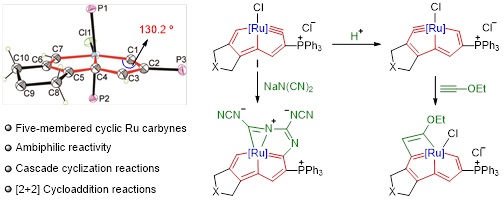芳香性和环张力的协同作用使钌杂戊搭炔表现出独特的反应性。如其既可与亲电试剂反应也可以亲核试剂反应,表现出“变色龙”的双亲反应性。另外,钌杂戊搭炔还可与炔烃发生[2+2]环加成反应生成钌杂环丁二烯衍生物,首次实现了钌卡拜与炔烃的环加成反应。钌杂戊搭炔的合成及反应性研究进一步丰富和发展了金属卡拜化学。