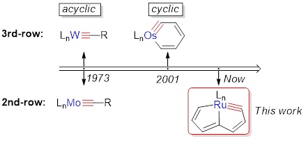 含过渡金属碳三键(M≡C)的金属卡拜化合物是许多有机反应的催化剂或关键中间体。对其合成及性质的研究是金属有机化学的热点之一。由于卡拜碳的sp杂化方式,大部分金属卡拜化合物均为链状结构(卡拜碳键角理想值为180 °),环内金属卡拜化合物因存在很大的环张力而难于合成。因此不难理解虽然链状金属卡拜化合物早在1973年已有报道,但环内金属卡拜直到2001年才得以实现,且目前金属中心仅限于第三过渡系金属。相对于第三过渡系金属卡拜化合物,第一、第二过渡系金属卡拜化合物的键能较小,因此稳定性更差,合成更加困难。