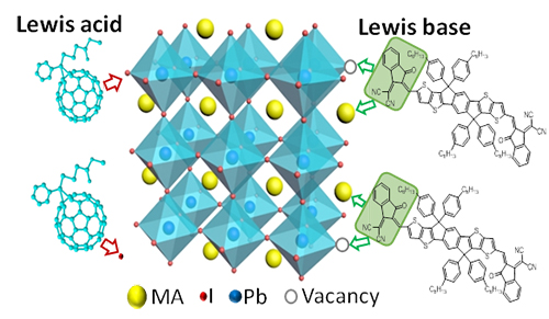 近年来,有机无机杂化钙钛矿太阳电池因其卓越的光电性能受到广泛关注,但低温制备的多晶MAPbI3钙钛矿薄膜,其晶界处存在的大量缺陷会引起载流子复合,严重影响电池器件的光电转换效率及稳定性。基于此,研究者通过反溶剂修饰技术,在MAPbI3钙钛矿中引入带有路易斯酸/碱功能基团的半导体有机小分子,使得器件效率由17.5%提升至19.3%。研究发现,半导体有机小分子与钙钛矿之间形成的路易斯酸碱加合物或卤素-富勒烯自由基,可以有效钝化Pb2+空位或Pb-I反位缺陷。同时,二者间能级匹配度的提升有助于增强缺陷钝化作用,提高载流子迁移率。