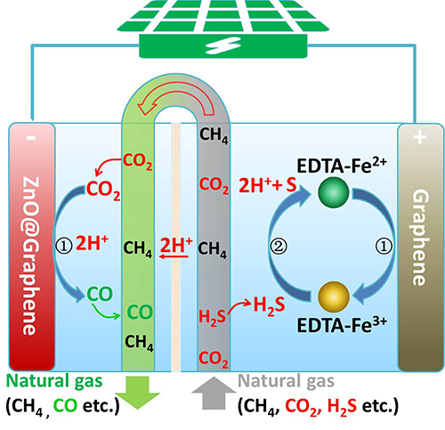 天然气的主要成分为甲烷(CH4),同时伴随产生CO2和H2S等酸性气体。这些气体通常是无用甚至有害的,对天然气的开采、运输、加工和使用造成困难。更为严重的是,一些天然气田因为高浓度CO2和H2S的存在,直接导致不能开发。将天然气中CO2和H2S气体资源化转化利用不但可以“变废为宝”,而且能够解决天然气开采和使用的问题,是兼具经济和环境双重效益的理想策略。长期以来,科研人员的主要精力聚焦在使用Claus技术将H2S催化燃烧为元素硫和水来消除H2S,但是将CO2和H2S同时资源化转化的方法鲜有报道。在本工作中,该团队提出并实现了一种光电驱动的将CO2和H2S协同转化为化学品的策略。该策略以廉价非贵金属为阴极催化剂(石墨烯包裹的氧化锌)还原CO2、以石墨烯为阳极催化剂氧化媒介体EDTA-Fe2+(用于氧化H2S),利用化学环反应将H2S氧化为单质硫磺和质子,质子和电子被用于CO2电化学还原生成CO,净结果是实现了计量化学反应协同转化(H2S + CO2 → CO + S + H2O)。本工作通过电化学策略实现了CO2和H2S协同转化,为天然气中有害气体(CO2和H2S)的净化和资源化利用提供了一条兼具经济和环境效益的绿色途径。