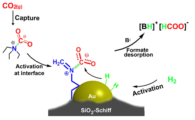 CO2加氢合成甲酸是一个原子经济性反应,生成的甲酸不仅是重要的化工原料,还可作为一种理想的液态储氢材料。CO2分子中的碳原子处于最高价态且化学性质相对惰性,对其进行有效活化是实现CO2高效转化的关键。该团队设计了一种席夫碱修饰的纳米金催化剂,利用席夫碱基团中的氮中心与CO2发生弱相互作用生成氨基甲酸盐两性离子,并进一步在纳米金催化剂上发生加氢反应生成甲酸。实验结果表明:不同于传统多相催化剂的碳酸氢盐加氢路径,气相CO2能够直接在席夫碱修饰的金催化剂上加氢转化为甲酸,在90oC、8.0MPa反应条件下,生成甲酸的转化数可达14,470(12h)。席夫碱与CO2这种弱的相互作用模式为CO2的低温活化提供了新途径。