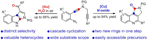 近日,iChEM研究人员、厦门大学叶龙武教授课题组和吕鑫教授课题组在过渡金属催化的杂原子取代炔烃氧化反应方面取得重要进展,相关成果以“Divergent synthesis of N-heterocycles viacontrollable cyclization of azido-diynes catalyzedby copper and gold”为题于2017年11月23日在线发表于《自然-通讯》(Nature Communications, 2017, 8, 1748)。
