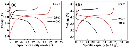 近年来,预锂化硬碳(Prelithiated hard carbon)已经应用于混合型锂离子电容器,并表现出优异的电化学性能。然而,预锂化工艺复杂、成本高,其涉及到纯锂电极的使用,存在安全隐患。在这一研究中,研究人员巧妙地利用了Li3V2(PO4)3正极材料的多步脱锂过程, 实现了硬碳的预锂化。在首次充电过程中,锂离子从正极脱出形成Li2V2(PO4)3,同时脱出的锂离子会嵌入到硬碳负极,并形成了预锂化的硬碳负极(LixC)。随后,Li2V2(PO4)3与LixC构成了一个锂离子电池体系。当在3.5 之4.3V充放时候(图1),该电池表现出类似超级电容器的高功率和长寿命。此外,虽然使用了常规的电解液LB303,该电池表现出优异的低温性能。在零下40摄氏度时,其的容量能够保持常温容量的67%,远优于常规的锂离子电池。这主要得益于纳米碳包覆Li2V2(PO4)3正极材料自身良好的低温性能和预锂化硬碳负极在低温下的相对快速的动力学过程。然而值得注意的是,该电池体系中只利用了Li3V2(PO4)3的部分容量,能量密度有限,比较适合用作起停电池。此外,随着温度降低,电解液的离子电导迅速下降,增加了电池内阻,因此,该电池在低温下表现出明显的极化。在后续研究中,还需要进一步开发高性能低温电解液,用于提升这种电池在低温下的电化学性能。