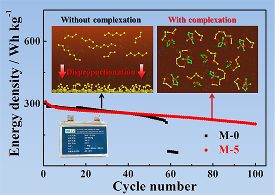锂硫电池具有能量密度高、成本低、环境友好的优势,是国际储能领域的研究热点之一。然而,由于锂硫电池存在多硫化锂飞梭、多硫化锂歧化、电解液分解、金属锂枝晶粉化等问题,导致其循环寿命短,尚未满足大规模产业化发展的要求。该研究团队针对多硫化锂歧化的问题,基于“软硬酸碱理论”,通过在电解液引入大体积阳离子来络合多硫根离子,有效提高了多硫化锂在电解液中的稳定性。采用该电解液组装的5000mAh锂硫电池器件的比能量可达300Wh/kg,且稳定循环100次以上,容量保持率约70%。该工作为提高锂硫电池的循环寿命提供了新思路和新策略。