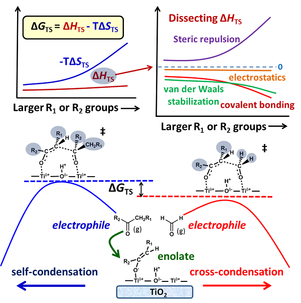 羰基化合物之间的羟醛缩合反应是实现有机含氧化合物C-C键偶联的重要途径之一。在金属氧化物催化剂上(如TiO2和ZrO2),羰基化合物首先在Lewis酸-碱对位点断裂α-C-H键生成烯醇式中间体;后者进一步亲核进攻吸附在邻位的另一分子羰基化合物生成新的C-C键。特别的,甲醛(HCHO)在与烯醇式中间体的C-C键偶联中表现出远高于长链羰基化合物的反应活性。然而,对于甲醛高活性的原因却一直缺乏深入的认识。该工作首次结合催化反应动力学和理论计算系统地考察金属氧化物表面甲醛同C2-C4羰基化合物在C-C键偶联反应活性上的差别。研究结果表明,相比于长链羰基化合物,甲醛与烯醇式中间体在C-C键偶联反应过渡态中具有较弱的C-C共价键和范德华相互作用,但同时也具有较小的空间位阻。以上两种效应对C-C键偶联反应活化焓的影响相互抵消,从而使得甲醛与其它羰基反应物在C-C键偶联Gibbs能垒上的差别主要取决于它们从气态到催化剂表面C-C键偶联过渡态的熵变。体积小的甲醛相应的熵变小,因此在烯醇式中间体亲核进攻中具有更高的反应活性。这一熵驱动的C-C键偶联反应活性反映了在固体催化剂表面被“束缚”的化学反应过渡态,并使反应温度成为调控不同羰基化合物之间C-C键偶联反应选择性的有效手段。