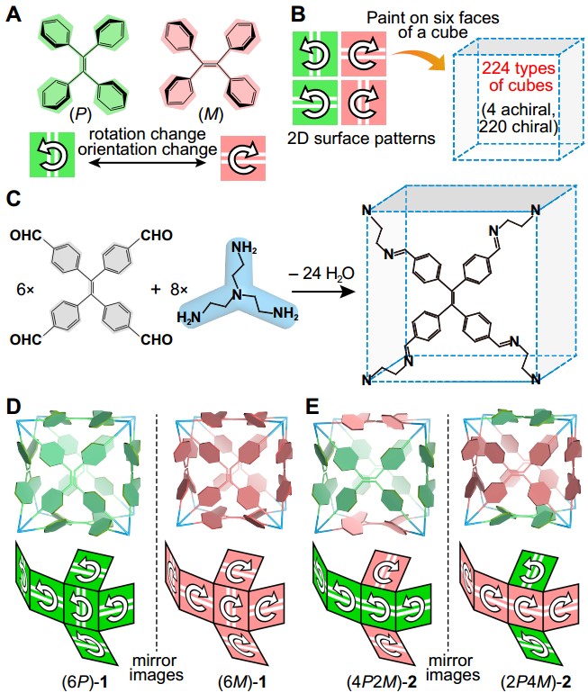 四苯乙烯是常见的聚集诱导发光基元,在空间位阻受限时具有P或M两种构象,结合其双键取向构成四种不同的面手性图案(图A)。将四苯乙烯基元置于分子立方体面上,结合数学图论分析,可得到224种可能组装体(图B)。该数学方法适用于分析其他复杂分子多面体。本工作以四苯乙烯衍生物为组装基元,通过动态共价化学,构筑分子面方向性立方体(图C)。实验上仅发现四种组装体(图D),并通过手性分离分析,发现随着组装体的行成“涌现”出手性与荧光性质。理论计算解释分子立方体手性涌现及手性稳定存在的原因。该类多面体在手性传感及手性荧光材料方面有应用前景。