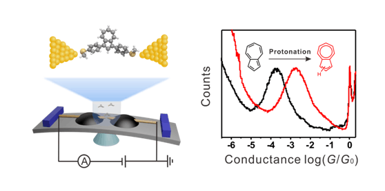 单分子尺度电输运性质的研究为从分子水平计分子材料和器件提供了直接实验依据。在单分子尺度,因电子不同传输路径引起的量子干涉效应对单分子尺度电输运性质有显著影响,而如何有效调控量子干涉效应从而控制分子器件电输运性质仍然是分子电子学领域重大挑战之一。在该项研究工作中,通过对奥甘菊系列分子单分子尺度电输运性质研究发现,5,7位取代的奥甘菊电输运能力低于其他取代位点奥甘菊分子,存在明显的相消量子干涉效应。加酸质子化后,质子化的奥甘菊分子电输运能力均有提升,其中具有相消量子干涉效应的5,7位取代奥甘菊分子结电导提升最显著超过一个数量级。理论计算显示,质子化作用降低了分子结的HOMO-LUMO能隙,同时HOMO能量增加并更靠近费米能级,从而提高了质子化奥甘菊系列分子结电输运能力。这一研究工作表明奥甘菊系列分子作为刺激响应结构单元在未来分子器件和材料中有重要的应用前景,同时基于质子化地量子干涉效应调控也为单分子器件电输运性质的未来设计提供了新思路。