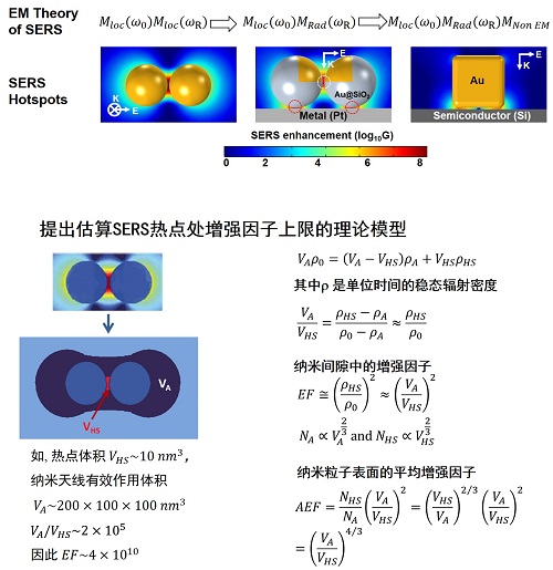 该综述从SERS理论和等离激元光子学相互促进发展的角度,系统综述了这两个领域发展过程中的系列里程碑式重要工作、当前发展重点和未来方向。在讨论SERS电磁场增强机理中第一步增强即局域场增强贡献的基础上,还讨论了SERS第二步增强即分子拉曼散射偶极子的再辐射增强的贡献,以及广泛使用的SERS增强因子正比于局域电场增强的四次方近似在三种情况下失效的问题。首次提出了利用纳米天线有效作用体积和纳米间隙中热点体积之比估算纳米结构SERS增强因子的新模型。发展级联结构支持多尺度电磁场耦合的策略,进一步提高局域场增强和偶极子再辐射增强。另外,还系统介绍了两类常见SERS体系的光学性质和SERS增强因子计算方法,该方法可为设计新的SERS活性纳米结构提供帮助。