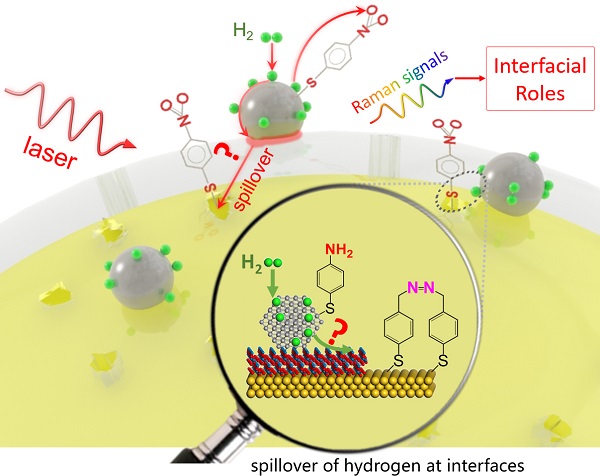 多相催化剂的表界面结构直接决定催化反应过程。利用原位表征技术从分子水平上揭示表界面结构对反应过程的影响一直是多相催化研究的热点。该论文通过构建Pt-Au、Pt-TiO2-Au、Pt-SiO2-Au等多种界面,结合对巯基硝基苯等模型探针分子,利用原位SERS光谱,获得了氢物种在不同界面上溢流的直接光谱证据。结果表明,氢气在Pt上解离后可经Pt-Au、Pt-TiO2-Au界面从Pt溢流至Au表明,且在Pt-Au界面上的速度要高于Pt-TiO2-Au;但该溢流过程在Pt-SiO2-Au界面则无法进行。该研究表明表面增强拉曼光谱可作为多相催化反应研究的新方法,并为揭示反应机理提供直接证据。