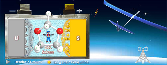 一直以来,科研人员使用硝酸锂添加剂来解决上述问题,但是硝酸锂、炭黑、单质硫共存的电池体系存在安全隐患。该研究团队首次设计出一类不含硝酸锂的高性能电解液,兼具较低的多硫化锂溶解度(Ksp)、较高的锂离子传导率、较高的单质硫利用率和优异的金属锂界面稳定性。采用该电解液组装的4000 mAh锂硫电池器件,其比功率可达60 Wkg-1,比能量可达350 Whkg-1,且能稳定循环30次以上,此技术有望使太阳能无人飞机连续飞行1个月。该工作为锂硫电池电解液材料的设计制备提供了新思路。