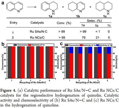 MOFs高温热解形成的N掺杂多孔碳材料具备较大的比表面、孔容,利于底物的传质过程。Ru SAs/N−C对喹啉及其衍生物区域选择性氢化反应表现出极高的催化活性、选择性。
