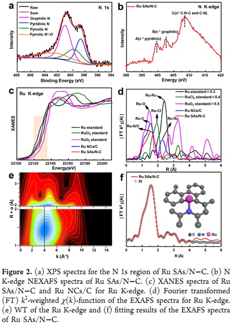 XPS N1s分谱表明,Ru SAs/N−C中N元素主要以石墨化N、吡啶N、吡咯N形式存在。X射线吸收近边结构(XANES)表明,Ru SAs/N−C中Ru为+3价。扩展X射线吸收精细结构谱(EXAFS)表明,Ru SAs/N−C中不存在Ru-Ru键。EXAFS 曲线拟合表明,Ru壳层配位数约为2.6±0.5。