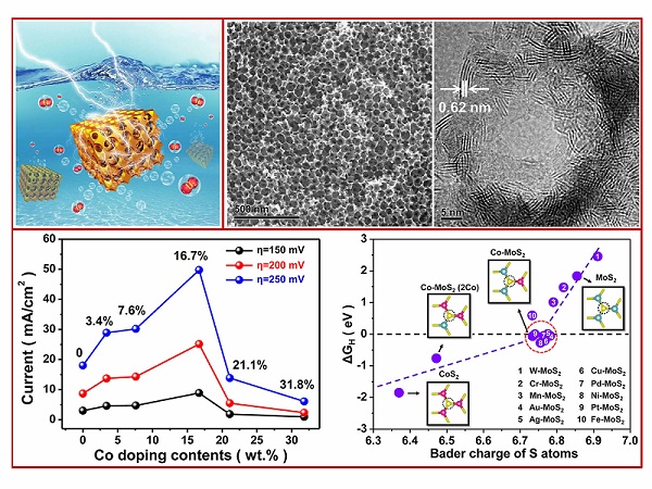 基于此,该研究团队通过不断创新合成策略,利用“自下而上”的合成方法,通过二氧化硅纳米小球作为硬模板,采用一步化学合成法得到了均一的介孔泡沫状硫化钼材料。多种分析手段表明该结构实现了其三重尺度上性质的有效调控:(1)在宏观尺度上,均一的介孔孔道有助于反应物(H3O+)和产物(H2)的传输,更加亲水的表面有利于催化剂活性位的接触;(2)在纳米尺度上,介孔框架内定向垂直生长的硫化钼纳米片层提供了丰富的边缘催化活性位;(3)在原子尺度上,在前期将单原子催化剂引入二硫化钼骨架里的基础上(Energy Environ. Sci., 2015, 8, 1594),将过渡金属钴原子引入到硫化钼平面内,替代部分钼原子,可以有效修饰表层硫原子的电子结构,进而激发了表层硫原子的本征催化活性,且实验及理论计算表明存在一个适中的钴原子掺杂量(16.7%)使得催化活性调变至最优值。基于此多尺度调控得到的三维多孔硫化钼基催化剂表现出了优异的酸性电解水制氢性能,展示了替代贵金属催化剂的潜力。该工作提出的多尺度结构和电子性质调控的策略为二维硫化钼在催化领域的研究和应用提供了新的研究思路,也为其它类似的二维催化材料的设计和开发提供了借鉴。