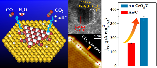 该研究团队在二氧化碳电催化还原前期研究基础上(J. Am. Chem. Soc. 2015, 137, 4288; Nano Energy 2016, 27, 35; Chem. Sci. 2017, 8, 2569; Nano Res. 2017, doi: 10.1007/s12274-017-1514-6),基于对金属-氧化物界面催化限域效应的充分理解(Science 2010, 328, 1141; Nat. Sci. Rev. 2015, 2, 183; Nat. Commun. 2017, 8, 14459.),设计合成了金属-氧化物界面结构的碳载Au-CeOx催化剂,在保证不同催化剂中Au纳米粒子尺寸和形貌相同的情况下,研究了Au-CeOx界面与二氧化碳电催化还原性能的内在关联。在 –0.89 V (vs. RHE)时,Au-CeOx催化剂上生成一氧化碳的法拉第效率达到89.1%,远高于单独的Au(59.0%)或CeOx催化剂(9.8%),生成一氧化碳的电流密度是Au的1.6倍。通过构筑CeOx/Au(111)模型催化剂,利用高分辨扫描隧道显微镜和同步辐射能谱进行原位研究,发现Au-CeOx界面显著促进了二氧化碳在CeOx表界面的吸附与活化,以及水的存在帮助了CeOx表面的还原与表面吸附二氧化碳物种的稳定。密度泛函理论计算进一步表明在后续的加氢过程中,Au-CeOx界面帮助稳定了关键中间物种*COOH,从而促进了一氧化碳的生成和脱附。这种界面增强的二氧化碳电催化还原在Ag-CeOx催化体系上得到了进一步证实,表明了金属-氧化物界面催化体系在二氧化碳电催化还原中的普适性。该研究成果提供了调控二氧化碳电催化还原性能的新途径,丰富和拓展了该研究团队提出的纳米限域催化概念。