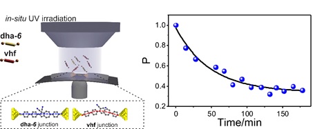 基于隧穿机制的电输运是物质世界的基本过程之一。在单分子尺度,分子结构的细微变化足以导致电学性质的显著区别,这也使通过单分子电学检测方法研究化学反应过程成为可能。在这一研究工作中,课题组将通常用于单分子电学测量的裂结技术用于单分子尺度反应动力学的表征。实验中采用了在太阳能能量存储和光致变色领域有重要应用的Dihydroazulene/Vinylheptafulvene(DHA/VHF)分子作为模型研究体系,通过对单分子事件的统计分析,定量表征了DHA光热反应的动力学过程并分析了反应产物。结合理论模拟,研究人员发现在单分子结的限域空间中,化学反应的动力学和热力学过程与宏观反应体系存在显著区别。这一工作也为未来的合成化学和化学工程研究提供了一种新思路,即通过纳米技术构造反应微环境,可以实现化学反应速率、产物和产率的优化。