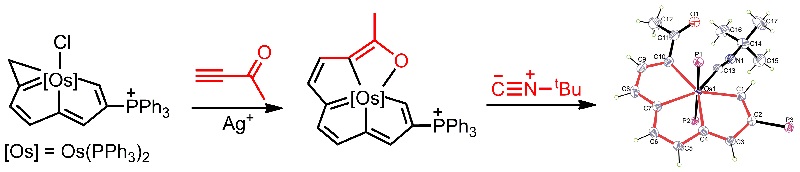 在经典有机化学中,因为中心碳原子的sp3杂化,由全碳原子组成的三并五元环骨架IV’是非平面的,至今仍未见报道。本文报道引入过渡金属替代有机三并五元环骨架IV’的中心sp3杂化碳原子,首次合成得到金属处于桥头位的三并五元环分子骨架。由10个碳原子组成的纯碳链与过渡金属螯合的分子骨架IV是碳龙化学的重要一环。