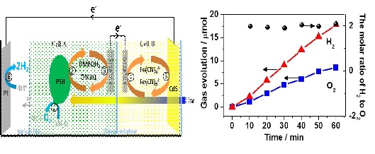 在本工作中,该团队从自然光系统PSII和PSI之间电子传递链的原理获得启发,在杂化体系中引入了两对氧化还原电对,并借鉴液体电池的原理,成功构筑了自然体系和人工光阳极之间有效的电子传递链,实现了太阳光驱动完全分解水。合理设计杂化光电池从CdS到PSII的叠层太阳能吸收,避免了PSII在短波长下的光破坏,提高了太阳能吸收效率。在AM-1.5G 模拟太阳光下取得了0.34%的太阳能到氢能转化效率,H2和O2自然分离。该研究为构建高效人工光合成分解水体系提供了的新的思路。