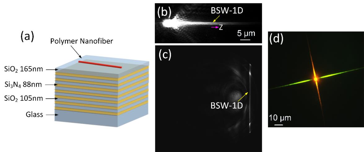 为了解决这个问题,课题组利用结构参数精心设计的多层介质薄膜来支撑聚合物纳米光纤,借助多层薄膜的光子带隙来阻止纳米光纤中光信号的泄漏。实验结果表明在该多层介质薄膜上,极细纳米光纤完全可以传输光信号,该传输模式即为新发现的一维布洛赫表面波,BSW-1D模式。