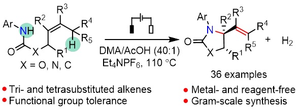 分子内烯丙基胺化是一类重要的有机反应,不仅构建出含氮杂环骨架,生成的烯烃结构还可作为进一步转化的反应位点。传统方法实现这类转化往往需要使用贵金属催化剂和氧化试剂,且对位阻大的多取代烯烃受限。课题组自组建以来一直致力于发展绿色氧化化学,在电氧化自由基化学领域已取得了一些重要进展【Angew. Chem. Int. Ed. 2017, 56, 587(Hot Paper);Angew. Chem. Int. Ed. 2016, 55, 2226(VIP); Angew. Chem. Int. Ed. 2016, 55, 9168】。本工作通过电解直接氧化简单、易得原料中的N-H键形成氮自由基活性中间体,随后经自由基环化和烯烃再生得到产物。该方法无需使用金属和氧化试剂,具有良好的官能团容忍度和底物适用范围,既解决了贵金属催化对大位阻烯烃效率低的问题,也为绿色、高效构筑C-N键提供了思路和方法。该工作实验部分主要由厦门大学研究生熊鹏完成,厦门大学博士生许荷欢参与了部分化合物的合成。