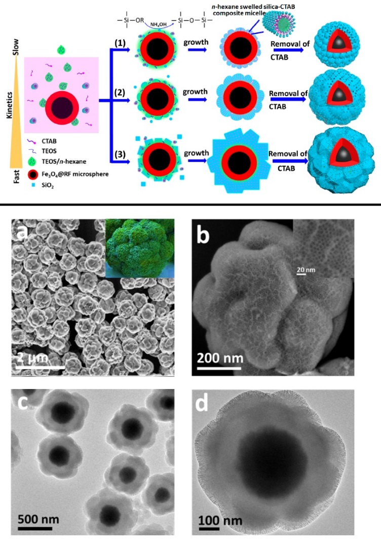 图1.纳米工程技术合成具有不同表面粗糙度的磁性介孔复合微球(上)以及微球的显微电镜图片(下)