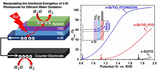 在本工作中,研究人员发现存在于n-Si/ITO肖特基结界面上的施主态能级阻碍了光生空穴抵达电极表面参与氧化反应,并确认了该施主态缺陷的能级位置;在n-Si和ITO之间引入薄层TiOx,并对其离散能级进行精细调控,有效地减少了界面施主态能级,并实现n-Si/TiOx/ITO肖特基势垒高度近理论值,从而极大地提高了光生电荷的分离和传递效率。其次,研究还证实了表面负载型NiOOH的双重角色,一方面作为传统认知的水氧化催化剂促进光生电荷的注入效率;另一方面修饰了该肖特基电极的表面功函,增加了势垒高度和内建电场强度,使可获得的表面光电压额外增加到215%倍。将n-Si/TiOx/ITO/NiOOH光电极水氧化反应的起始电位从文献报道的约1.1-1.2V降低至0.9V,为目前文献报道的最低值。同时在一个较宽的电极电位下实现了光生电荷注入效率大于90%以及电荷分离效率接近100%。该研究结果,不仅适用于硅基光阳极,还可有望拓展应用至其他半导体基光电器件的制备中。本项工作也是继该团队非晶硅的相关研究后(ChemSusChem, 2015, DOI: 10.1002/cssc.201501004)在单晶硅用于光电化学分解水方面取得的新进展。