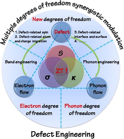 基于“缺陷工程”策略实现对热电性能的“多自由度协同优化”思想的示意图