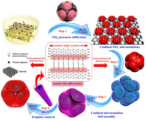 图1.空间限域微乳液自组装法合成介孔TiO2单晶超级结构示意图