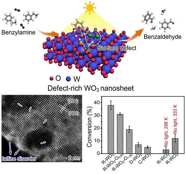 基于氧化钨纳米晶体缺陷工程的光催化有氧偶联技术原理图示及性能