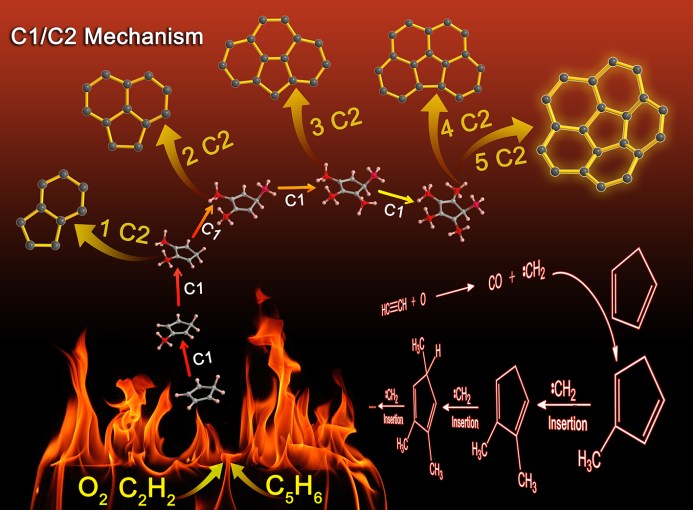 为了更好地理解纳米碳材料弯曲的形成机理,谢素原课题组长期致力于寻找一些弯曲分子形成过程中的中间体作为解释机理的实验证据。基于这样的想法,选择了五元碳环的环戊二烯(简称Cp)作为起始原料,采用低压氧气-乙炔火焰燃烧的方法,成功地原位捕捉或在线生成了一系列含有五元环结构的C5-C20中间体,形成了系列的实验证据链,提出了C1取代及C2加成相结合的机理,该机理为纳米碳材料(比如C20H10)弯曲的形成提出了新的见解。