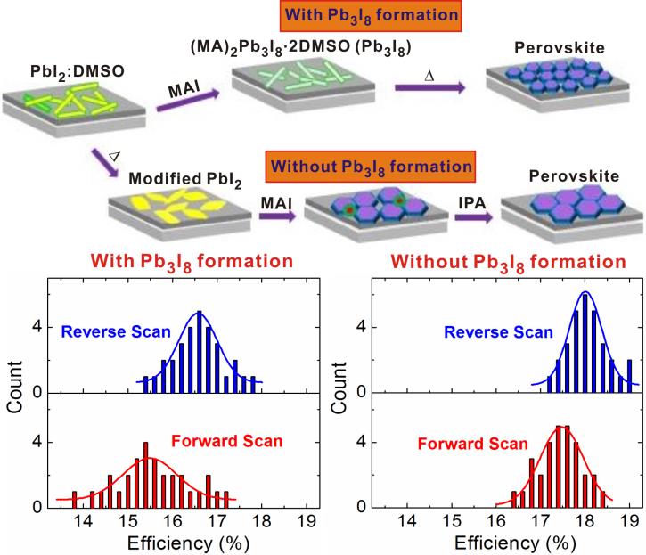 短短七年时间,钙钛矿型太阳能电池的效率从3.8%攀升到了22.1%,高质量钙钛矿薄膜的制备对提升该类太阳能电池的性能至关重要。2015年以来,大量研究发现在钙钛矿前驱体溶液中引入适量DMSO溶剂,可大幅提升钙钛矿薄膜的质量及相应太阳能电池的效率,但DMSO在钙钛矿薄膜加工过程中所扮演的角色却仍未得到明确的解释,存在DMSO用量窗口范围窄的缺点。对于CH3NH3PbI3型钙钛矿,DMSO的引入会形成(MA)2Pb3I8·2DMSO (Pb3I8)中间体结构,普遍研究认为该中间体的形成是制备高质量钙钛矿薄膜的关键。通过系统捕获一系列中间体结构,该项研究发现:1)引入DMSO提升钙钛矿薄膜质量主要是通过改善PbI2前驱体薄膜质量实现的;2)Pb3I8中间体的形成并非制备高质量钙钛矿薄膜的重要因素;3)钙钛矿薄膜加工使用的多余CH3NH3I会导致富I化合物的形成,进而加大电池迟滞现象。基于以上发现,该研究进一步发展了一种新的钙钛矿薄膜制备工艺:先通过加热PbI2-DMSO前驱体薄膜制备介孔PbI2薄膜,以排除DMSO加入量对钙钛矿薄膜形成的影响;再将所制备介孔PbI2薄膜浸泡于热的CH3NH3I溶液中充分反应(不经历Pb3I8中间体过程);然后用异丙醇冲洗薄膜除去多余的富I化合物,从而得到晶粒尺寸达到1~2 μm的高纯度、高质量钙钛矿薄膜。相对于传统DMSO工艺,该工艺得到的太阳能电池表现出更加优异的光电转化效率以及非常小的迟滞,为钙钛矿太阳能电池的制备以及优化提供了新思路。