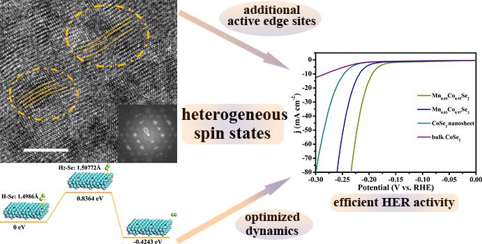 氢气由于其高的能量密度和极低的环境污染,使其成为一种理想的可持续能源的载体。电催化析氢被认为是一种高效产氢气的方式。而这些电催化过程都需要催化剂来降低反应的过电位。尽管一些贵金属电催化如Pt表现出相当不错的催化性能,但其丰度低,不易获取等缺点阻碍了电催化析氢的广泛应用。因此寻求高效,廉价的非贵金属电催化剂成为目前的一个挑战。在众多的非贵金属电催化剂中,第八族过渡金属硫属化合物ME2(M代表Fe, Co或Ni,E代表S或Se)由于其高丰度,高稳定性还有其本征的电催化活性吸引着材料学家们的广泛关注。但是,对其本征的活性位点和电催化动力学的调控仍显不足,这样极大限制其电催化性能的进一步优化。根据前人文献报道,这类催化剂的活性位点位于边缘的硫属原子,因此暴露更多的边缘位点是优化这类电催化剂活性位点的主要思路。在二维原子平面内构建微小无序能够在保证原有的二维电子共轭的前提下能够有效地增加边缘的活性位点,是增加活性位点的理想模型。由于异相自旋也就是异质原子掺杂能够在二维平面内产生不平衡的库伦作用,这种微小的不平衡的库伦作用能够为构建微小扭曲提供驱动力。同时,通过调节掺杂量为调节无序度(边缘活性位点)提供了便利。另外,异相自旋的并入不可避免地会调控催化剂的电子结构,从而能为优化电催化析氢反应的反应能垒提供可能。基于以上的分析,掺杂异相自旋是在原子排布和电子结构层面上协同优化第八族过渡金属硫属化合物ME2的活性位点和动力学过程的有效策略,为提高这类催化剂电催化析氢性能提供了可能。