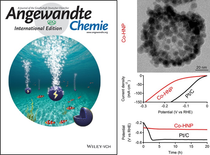 氢气是清洁、可再生能源技术的理想能量载体,可通过电解水快速大量制备。使用电化学催化剂可以降低电解水产氢反应的过电势,从而提高能量转化效率。目前工业上使用的电解水产氢催化剂多采用以铂为代表的贵金属材料,价格昂贵且资源匮乏。利用非贵金属材料制备低成本、高效能的电解水产氢催化剂是能源、催化和材料领域的研究热点,并已经取得了重要进展。但是,目前的电解水产氢催化剂大多需要在强酸或者强碱性电解液中使用,这可能带来一些环境和安全问题,因此发展可以在中性电解液中工作的高性能产氢电催化剂具有重要的应用价值。针对这两个问题,iChEM研究人员、中国科学技术大学马明明教授课题组设计了一种由钴纳米晶自组装形成的纳米空心球,可以作为催化剂在中性水溶液中高效的催化电解水产生氢气,并且可以在大电流密度下长时间稳定工作,优于商用铂/碳催化剂的表现。该工作近期在Angew. Chem. Int. Ed. 上在线发表, (doi:10.1002/anie.201601367),并被选为内封面进行重点介绍(doi:10.1002/anie.201603780 )。论文的第一作者是二年级博士生刘炳瑞。