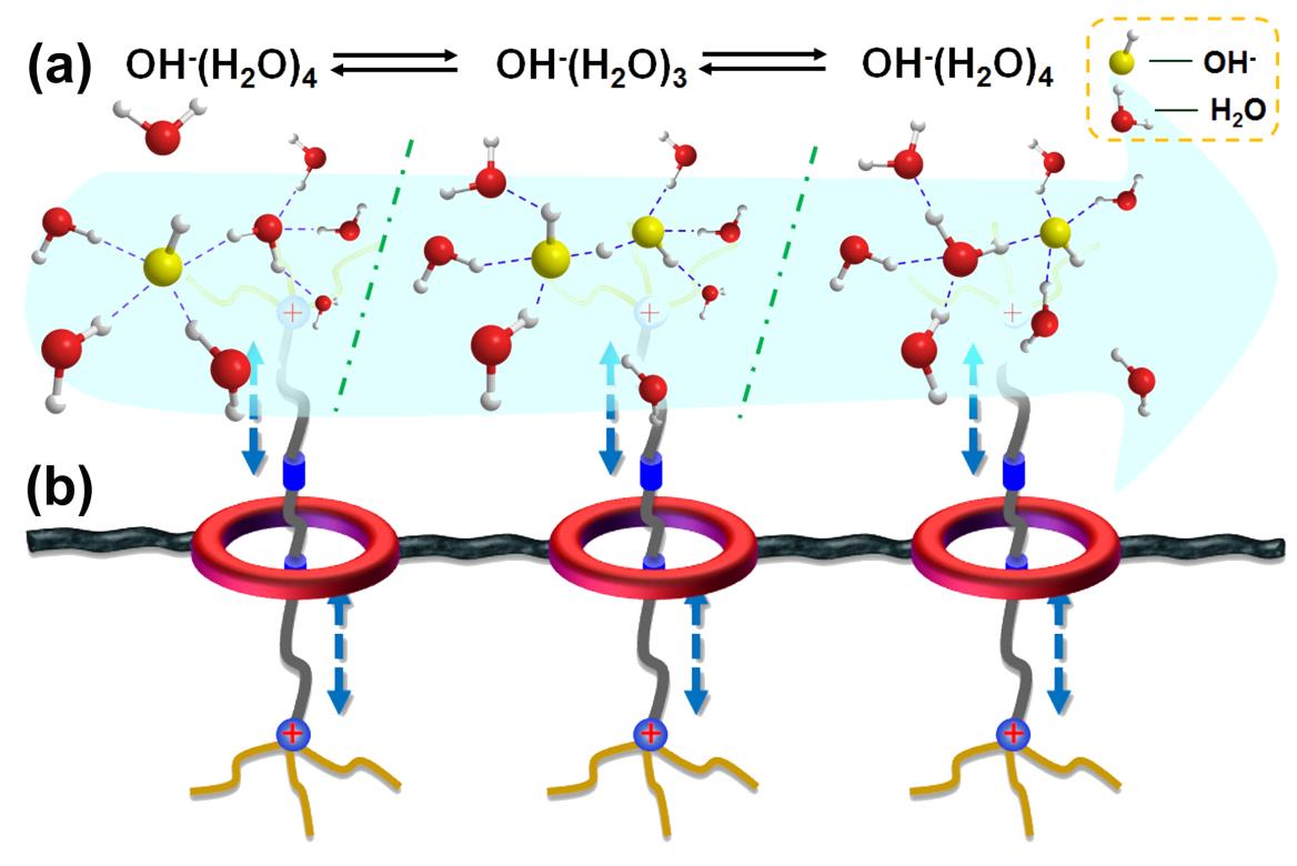 碱性聚电解质膜燃料电池(APEMFC)具有绿色、电极反应动力学快以及不依赖于贵金属铂催化剂等优点是目前的研究热点。该技术的核心部件之一,碱性阴离子交换膜由于结构的缺陷导致OH-电导率与稳定性无法兼顾。传统膜均以共价键形式将功能基团(如季铵阳离子链接在聚合物链段上,离子传导率严重依赖于功能基团的含量,增加含量虽然能提高OH-电导率传导性能,但导致膜过度溶胀降低使用寿命。该研究成果突破了现有离子膜结构的制约,原创性提出离子化合侧链局部“穿梭”加快离子传导的概念。具体通过主客体化学,将离子化链段嵌入含冠醚高分子主链中并封端制备出“穿梭”侧链型离子交换膜。由于断裂主客体相互作用所需要的活化能较低,离子化侧链可在一定温度和pH值环境下(50-80℃,碱性)摆脱冠醚束缚,局部自由“穿梭”,增加周围水合离子的扰动程度,加快离子传导。与传统共价键结合阴膜相比,在离子交换基团含量较低的情况下(IEC= 0.68 mmol/g),OH-离子电导率在80℃时达到189 mS/cm,这种特殊的“穿梭”构型摆脱了离子传导性能对功能基团含量的依赖,提出了一种全新的离子传导机制,对设计高性能离子膜和发展燃料电池技术具有重要意义。
