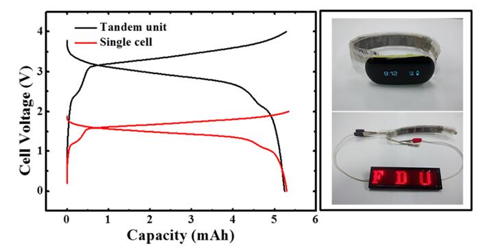 与现有报道的柔性电池体系相比,该柔性水系锂离子电池具有较高的活性物质担载量(20mg cm-2),因此具有较高的体积比能量(124 mWh cm-3, 63 Wh kg-1)和体积比功率(11.1W cm-3,3275 W kg-1),并且在不同的弯曲状态下能保持相同的容量,表现出优良的柔性。两个柔性电池串联电压可达4 V,与当前非水有机锂离子电池相媲美。此外,该柔性电池还可以与商业化的柔性太阳能电池组合成自充电单元,这有利于柔性可穿戴电子设备在长时间户外运动中的工作。这种柔性电池不仅具有很高的活性物质负载量和电池体系的高安全性,还有良好的倍率性能和高功率密度以及优异的弯曲性能和柔韧性,而且质量轻、成本低、安全性高、环境友好,特别适合应用在可穿戴电子设备领域。