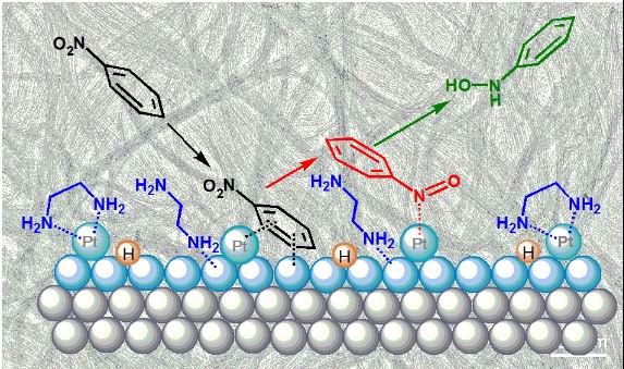 通常认为,硝基苯加氢经历亚硝基苯和羟基苯胺等活泼中间体,最后生成热力学稳定的硝基苯。传统铂催化剂很难将反应停留在中间状态,不利于高选择性得到热力学上不稳定、但却是重要化工中间体的羟基苯胺。理论计算表明,乙二胺修饰铂纳米线表面的Pt-对硝基苯和亚硝基苯等缺电子底物的吸附有利,但显著抑制了富电子苯基羟胺的吸附。当硝基苯被氢化至苯基羟胺时,会由于静电排斥作用而离开催化剂表面,避免了深度氢化。在深入理解界面电子效应的基础上,他们发现通过在商业铂黑催化剂表面原位沉积铂-乙二胺配合物修饰层,可以极大改善了催化剂对芳香羟胺的催化选择性。该策略简单易行,而且灵活可控,充分展示了配位化学在发展新催化材料中的重要性。
