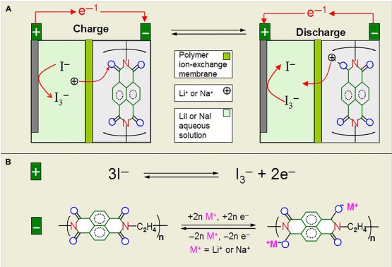 传统的锂离子电池的工作原理是基于锂离子在正负极电极的嵌入/脱嵌,也称“摇椅式电池”。新型电池工作原理与传统的锂离子电池相似:正极反应基于溶液中I3-/I-电对的氧化还原,负极反应基于聚酰亚胺上羰基的可逆烯醇化反应,锂离子/钠离子聚合物交换膜为电池隔膜,充放电过程中伴随着锂离子Li+(或钠离子Na+)在正负极之间的迁移。与传统电池有限的循环寿命和功率密度相比,该体系中电池的正负极电极反应均不涉及离子在固体材料中的扩散及其由此引起的充放电过程中电极材料的体积,能够将电池的高能量密度和电容器的长循环寿命与高功率密度有效地结合起来。实验表明,正负极材料均表现出较快的电极反应动力学,使得电池表现出类似电容器的高功率性能。电池在0~1.6V的电压窗口之间充放电,可以循环高达50,000次,这远远超过了传统可充电电池的循环寿命(< 10,000次)。