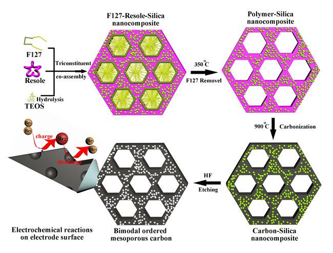 近日,iChEM研究人员、大连化物所张华民、李先锋研究员领导的研究团队在锌溴液流电池电极材料研究方面取得新进展。锌溴液流电池具有高理论能量密度、电解液成本低的优势,在大规模储能领域具有较好的应用前景。但其Br2/Br-反应活性较低,导致其工作电流密度较低(~20mA/cm2),造成电堆功率密度低,材料成本高,严重制约了其发展。为了提高Br2/Br-电对的反应速率,进一步提高锌溴液流电池的功率密度,研究团队通过结构设计开发出高度有序的介孔碳正极材料,并将其应用于锌溴液流电池。该电极材料为Br2/Br-的反应提供了更多的活性位点,提高了其反应动力学速率;同时高度有序的孔结构可以有效地降低溴的扩散阻力。用其组装的单电池在80mA/cm2的电流密度下运行,能量效率超过80%,突破了低功率密度的制约瓶颈,为高功率密度、低成本的锌溴液流电池的开发打下了良好的基础。相关研究成果在线发表在Nano Energy, 2016, 21, 217-227上。