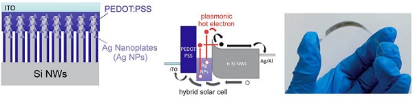 该工作的创新点在于,研究人员基于课题组先前研究的半导体-金属界面上的热载流子注入效应(Angew. Chem. Int. Ed. 2014, 53, 3204;Adv. Mater. 2015, 27, 3444),将具有近红外等离激元吸收带的银纳米片结构引入无机-有机异质结和肖特基型两种光伏器件中,分别取得了近红外光区光电转换性能提高。在近红外光照下,等离激元效应产生的热电子可以直接注入到硅半导体导带中,将该波段中的光电转换量子效率提高了59%。
